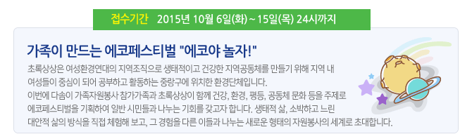 | ÃÊ·Ï»ó»ó ÁÖ°ü °¡Á·ÀÚ¿øºÀ»ç ÇÁ·Î±×·¥¿¡ Âü°¡°¡Á·À» ¸ðÁýÇÕ´Ï´Ù. |